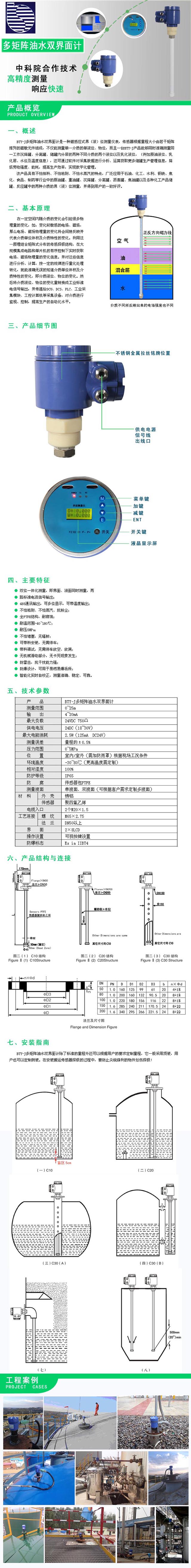 BTY-J多矩陣油水雙界面計(jì)是一種磁感應(yīng)式界(液)位測(cè)量?jī)x表,傳感器根據(jù)量程大小由若干矩陣排列的磁敏元件組成,不僅能測(cè)量單一介質(zhì)的單液位、物位,而且一臺(tái)BTY-J產(chǎn)品能夠同時(shí)準(zhǔn)確測(cè)量同一工作沉降罐、分離罐、儲(chǔ)罐內(nèi)分層的兩種不同介質(zhì)的兩個(gè)液位以及乳化液位,(例如原油液位、乳化層、水位及溫度信息),還可通過軟件對(duì)采集數(shù)據(jù)進(jìn)行分析、運(yùn)算獲取更多儲(chǔ)罐生產(chǎn)管理信息,降低勞動(dòng)強(qiáng)度、能耗,提高生產(chǎn)效率,實(shí)現(xiàn)數(shù)字化管理。 該產(chǎn)品具有不怕掛料、不怕粘附、不怕水蒸汽的特點(diǎn),廣泛應(yīng)用于石油、化工、水利、鋼鐵、焦化、食品、制藥等行業(yè)中的原油罐、重油罐、沉降罐、分離罐、瀝青罐、焦油罐以及各種化工產(chǎn)品儲(chǔ)罐、反應(yīng)罐中的兩種介質(zhì)的界(液)位測(cè)量,并得到用戶的一致好評(píng)。